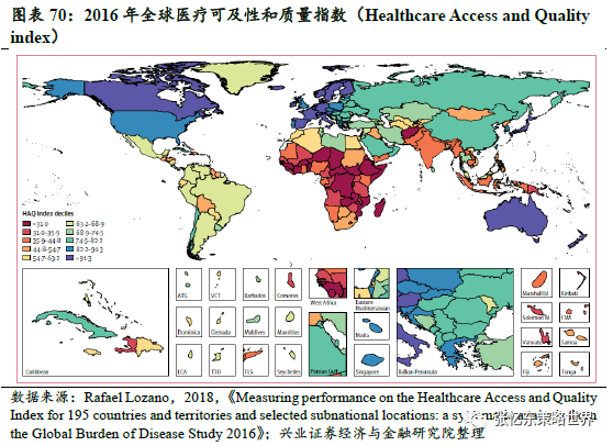 第三,新兴市场国家医疗资源相较于发达国家更为脆弱。根据柳叶刀杂志所载文章[1],2016年全球医疗可及性和质量指数地图显示,印度、孟加拉国、尼日利亚等所在的南亚、东南亚及非洲地区医疗可及性和质量指数较低。