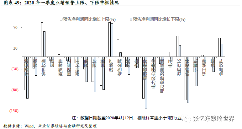从A股公司最新披露的2020年一季报业绩预警、根据预警不同行业的净利润同比增速上限和下限的中枢来看,食品饮料、地产等行业值得关注。