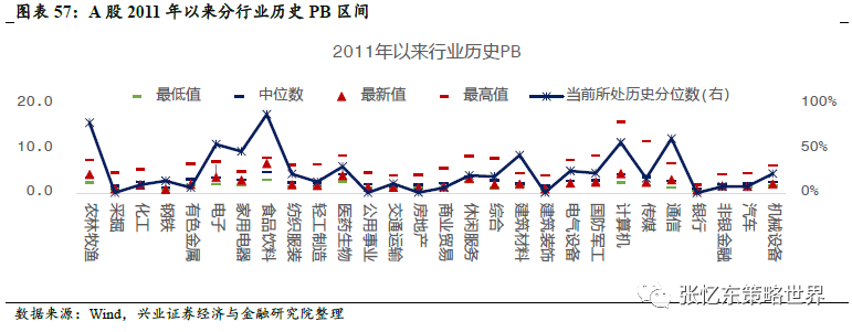 从市净率角度来寻找A股行业的估值洼地(以下括号内为其分位数数值,其历史区间为2011年第一个交易日至今)国防军工(22%)、机械设备(22%)、纺织服装(22%)、传媒(17%)、钢铁(14%)、轻工制造(13%)、交通运输(11%)、化工(9%)、汽车(8%)、非银金融(7%)、有色金属(6%)、商业贸易(6%)、房地产(1%)、建筑装饰(1%)、公用事业(1%)、采掘(1%)和银行(小于1%)。