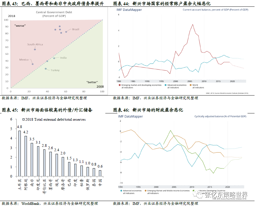 政府债务率提升。以巴西、墨西哥和南非为例, IMF 2018年最新数据显示,巴西、墨西哥和南非政府债务/gdp分别为82.5%、35.4%和56.7%,而这一数值在08年分别为60.7%、24.0%和26.5%。