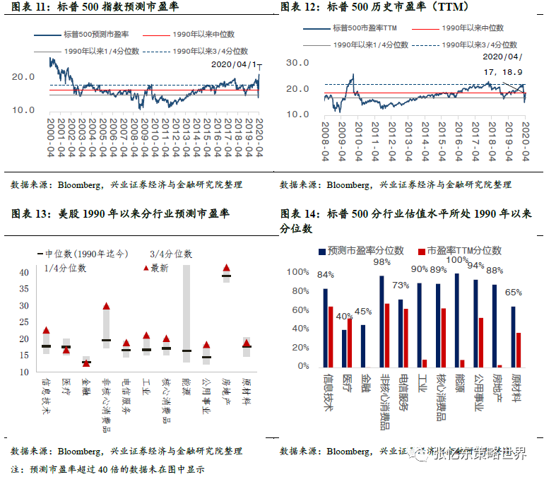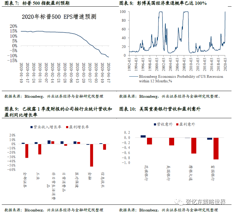 首先,随着财报季启动,美国上市公司盈利预测面临新一轮的猛烈调整是大概率事件。她周报里面说,截至4月17日,根据Bloomberg统计的标普500指数2020年一致预期EPS增速已经下降为-11.3%。1)美国经济衰退概率大幅提升,彭博经济研究的美国衰退概率模型显示,美国经济将在未来12个月步入衰退的概率从2月份的33%升至3月的100%。2)实际披露的Q1财报弱于预期。截至美东时间4月16日,标普500指数成分股中已披露一季度的40家公司相较于2019Q1净利润同比下降32.66%。分行业来看,除非日常生活消费品业(同比增长6.13%)和医疗保健(同比增长4.26%)外,其余行业净利润均有所下降,其中金融业盈利下滑最为严重,相较于2019Q1,2020Q1金融业净利润同比下降53.01%,严重逊于预期。