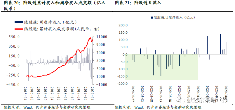 从北上资金看外资抄底积极性。A股2月21日至3月23日,北上资金大幅流出1080亿元,但3月底美国流动性危机缓解之后,外资开始回流。尤其是0415-0419这一周,陆股通净流入金额300.2亿元人民币,主要流入食品饮料、家电和医药等行业优质资产。