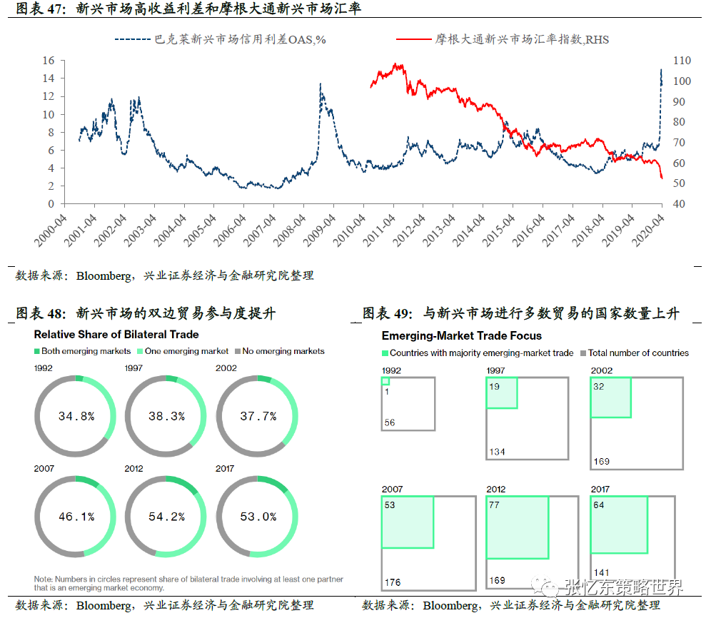 根据彭博的统计,在2007年,有新兴市场参与的所有的双边贸易中占比为46.1%,而在2017年该数值提升至53.0%。截至2017年,与新兴市场进行多数贸易的国家数量也从2007年的53个增加到64个。