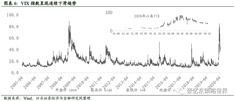 由此,美联储的资产负债表在本次冲击下迅速扩张,截至4月13日扩张至6.27万亿美元。所以,我们看到美国金融市场:1)流动性愈发改善:LIBOR-OIS息差3月27日达到高位的137.9 bps之后不断下滑,截至4月17日,该数值下降至105.9 bps;2)信用市场的压力大幅减小:巴克莱美国高收益利差在3月24日高达10.8%,此后该数值一路下滑,截至4月17日收盘至7.05%。3)投资者情绪慢慢改善:VIX指数在3月18日一度触及85.47后逐渐回落,截至4月17日收盘38.15。
