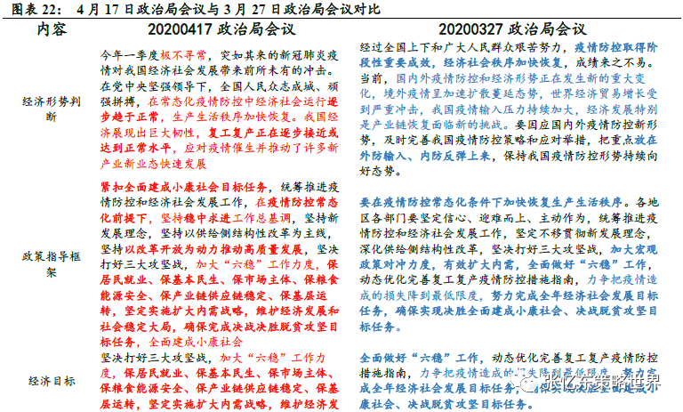 0417政治局会议对于经济形势的判断:“极不寻常”。相比3月27日对于经济形势判断的表示——经过全国上下和广大人民群众艰苦努力,疫情防控取得阶段性重要成效,经济社会秩序加快恢复,4月17日政治局会议对于经济形势判断的表述为:今年一季度极不寻常。