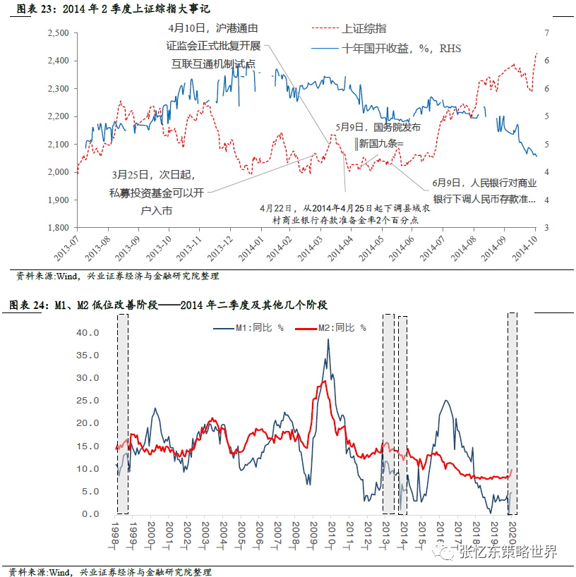 其次,与当前相似,金融数据2014年二季度也是低位改善。2014年3月到6月,M2同比增速分别为12.1%、13.2%,13.4%和14.7%;M1同比增速分别为5.4%,5.5%、5.7%和8.9%。