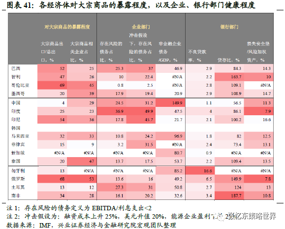通胀背景下,央行采取紧缩性的货币政策打压通胀,同时会抑制国内需求。所以新兴市场往往体现出“经济下行、货币反而收紧”的特征。根据兴证宏观团队的研究,从2000-2018年阿根廷,土耳其,印度,巴西,印尼等国的政策利率和汇率呈现负相关关系,体现了“贬值-通胀-加息”模式。