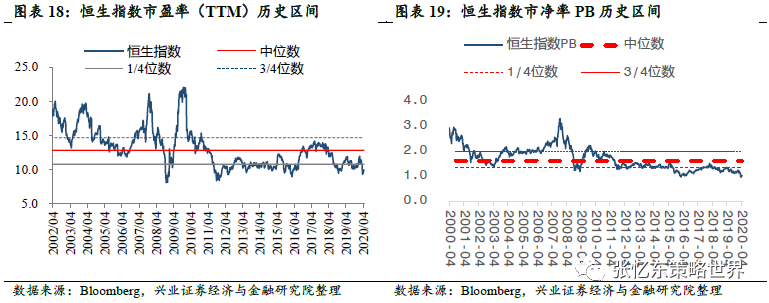 港股估值处于历史低位。截至4月17日,恒指预测PE为10.6倍,低于2005年7月以来的1/4分位数,恒生国指预测PE为8.3倍,处于2005年7月以来的1/4分位数和中位数之间;恒生指数PE TTM为9.9倍、PB为1.0倍,恒生国指PE TTM为7.8倍、PB为1.0倍,二者PE TTM和市净率均低于2002年以来的1/4分位数。