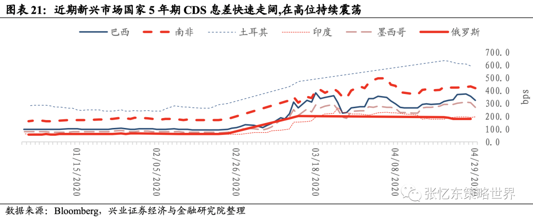 相比2008年,新兴市场国家的政府债务率提高、外债规模相比于其外汇储备较大、经常账户盈余大幅恶化、财政盈余恶化,所以,当前新兴市场应对危机的能力更脆弱,主权信用违约风险加大。
