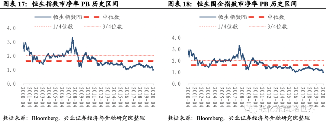 截至4月29日,恒指预测PE(彭博一致预期)为11倍,处在2005年7月以来的1/4分位数附近;恒生国指预测PE为8.6倍。恒生指数当前静态估值(PE-TTM)10.2倍;恒生国指PE-TTM为8.2倍,二者均低于2002年以来的1/4分位数。