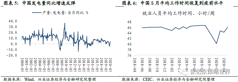 投资、发电量、劳动力市场等诸多数据显示,6月份中国经济活动已经恢复至疫情前的正常水平。平均工作时间从2020年5月44.3小时/周快速上升至6月46.1小时/周,2019年同期为45.7小时/周。PMI数据已经连续四个月站上荣枯线。