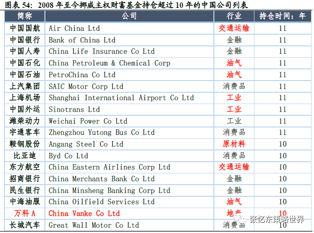 以全球最大的主权基金——挪威主权财富基金为例,2008年至今挪威主权财富基金持仓开始长期持仓中国周期类核心资产。例如中国国航、中国银行、中国人寿、中国石化、中国石油、上汽集团、上海机场、中国外运、潍柴动力、中海油服、万科A、华新水泥和江西铜业等近30只相关标的持仓时间已经超过10年。