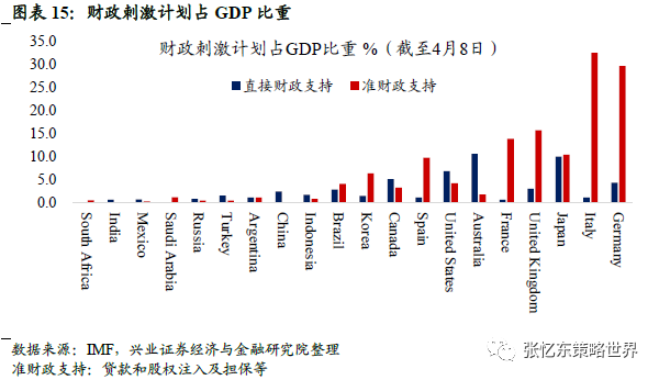 2020年海外出台了史无前例的财政大刺激,一旦海内外库存周期共振,那么这一轮库存周期可能比预期的更强一些:截止4月初,根据IMF数据,直接财政刺激计划占2019年GDP比重美国6.9%、日本10%、德国4.4%;包含准财政支持的财政刺激计划占GDP比重德国和意大利接近35%、日本20%、美国11%。
