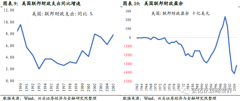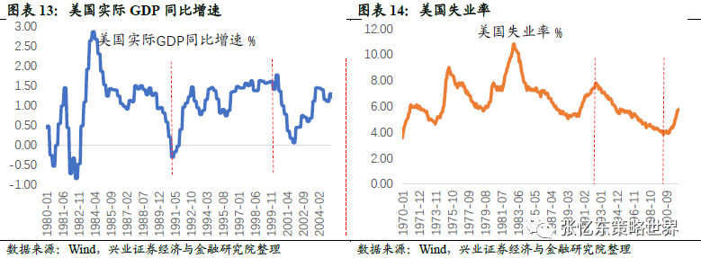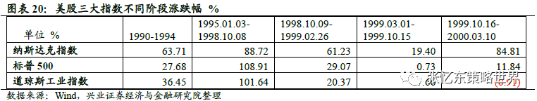 低通胀,科网泡沫后期回升:90年代通货膨胀率基本被控制在较低水平,其中美国GDP平减指数从1990年的3.7持续下降至1998年的1.1,CPI同比增速则从1990年10月的6.3%持续下降至1998年11月的1.5%。但1998年12月之后,通胀由下行通道转为上行通道从而部分回涨,CPI同比增速在2000年3月回升至3.8%。