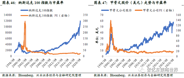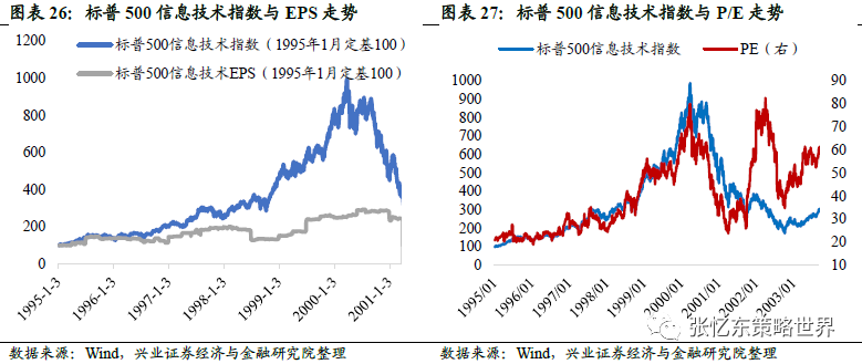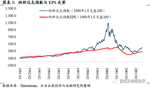 1998年10月之后,纳斯达克指数由1998年10月份的低点1492.49点迅速攀升至2000年3月10日的巅峰5048.62点,涨幅达到238.3%,年均涨幅125%;与此同时,估值迅速提高至69.4倍,上涨178.7%,年均涨幅98%。这说明在这个阶段,纳斯达克指数的上涨几乎完全来自于估值的提升,股价上涨计入了过分乐观的预期,远远偏离了基本面,互联网泡沫吹起。