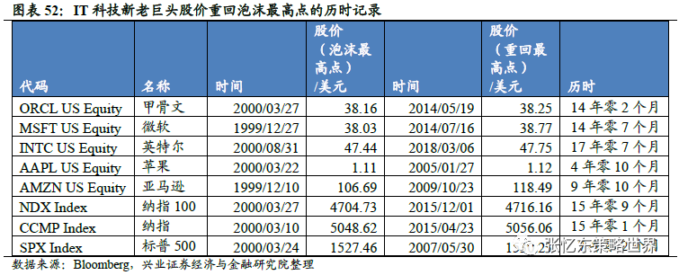 传统IT科技巨头度过“失去的十五年”,带动纳斯达克100指数走出相似行情。甲骨文的股价在2000年3月27日创出历史最高位38.16美元,泡沫破裂后直到2014年5月19日才再创新高38.25美元;微软的股价在1999年12月27日达到顶点38.03美元,泡沫破裂后直到2014年7月16日才再创新高38.77美元;英特尔的股价在2000年8月31日突破历史高点47.44美元,泡沫破裂后直到2018年3月6日才再创新高47.75美元。纳斯达克100指数受到影响不小,其在2000年3月27日曾一度创下历史最高位4704.73点,在泡沫破裂后同样经历了漫长的恢复期,直到2015年12月1日才再创新高4716.16点。