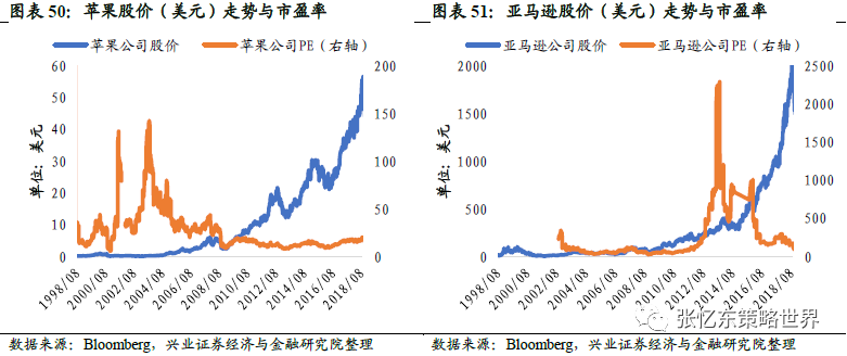 IT科技后起之秀较快恢复到泡沫破裂前水平,后期股价进入加速上行通道。苹果的股价在2000年3月22日曾达到过1.11美元的历史高位,在泡沫破裂后只花了不到五年时间便恢复到泡沫破裂前水平,此后更是加速上涨。亚马逊的股价在1999年12月10日创下历史高位106.69美元,泡沫破裂后只花了不到八年时间便再度破百,2009年10月23日创下新高118.49美元。