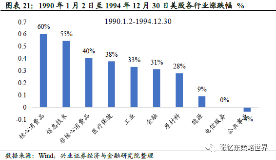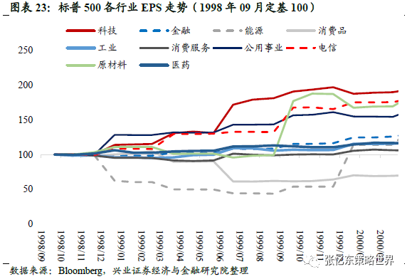 科技行业受外部冲击较小,业绩亮眼。1993年以来,美国各行业EPS指标整体处于上行通道。但1998年后,传统行业如能源、原材料、消费品业绩处于下行区间,信息技术和电信服务盈利继续提高。根据彭博计算数据,能源EPS由1997年底的8.0美元跌至99年2月的4.2美元,原材料EPS自1995就进入下行通道,由1995年底的9.3下降至99年2月的4.8美元。反观,信息技术行业EPS由98年6月底的6.21美元上升至1999年2月的8.0美元,同期电信服务由6.06美元上升至6.79美元,此后仍保持上行趋势。