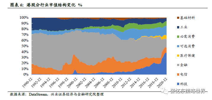 南下资金除了配置绝对低估的蓝筹股,更多资金配置了新经济的核心资产,这和港股市场自身结构的变化有非常大的关系,一大批优质的新经济公司在港上市吸引了内地资金。2018年以来,港股改变发行制度,迎接中概股回归、接纳新经济,使得港股的行业市值结构显著优化,已初步实现科技、医药、新消费为主导的转型。科技行业市值占比由2019年1季度末的18.6%上升至2020年11月的41%,居于首位;可选消费+必需消费占比24%;医疗保健均占比7%;而金融占比从2019年1季度末的37.1 %降至2020年11月的13.6%。