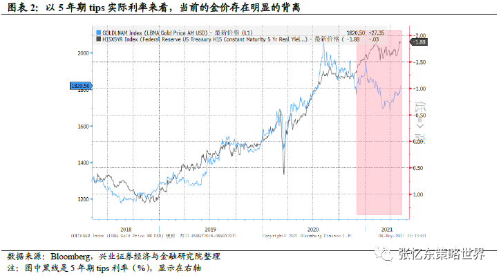 黄金一季度明显调整,当前的实际金价和实际利率走势所预示金价存在背离。以5年期tips为例:2021年开年之后,5年期tips所显示的实际利率大幅走低,但一季度黄金大跌。3月底4月初以来,黄金重回升势,但与实际利率背离仍大。