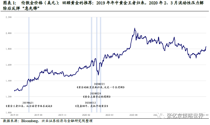 1、回顾我们对黄金的推荐:2019年年中推荐黄金“王者归来”,2020年3月流动性压力解除后建议配置黄金