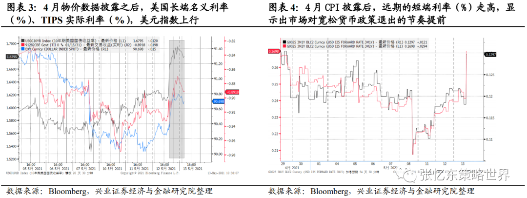 1)短期由于美国通胀显著超预期,实际利率有走高风险,但考虑到美国失业率仍在高位、美联储依然鸽派,美债长端名义利率上行斜率放缓,从而,5、6月份美国实际利率更多是低位震荡,较难超预期大幅反弹。