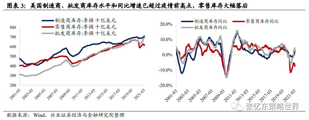 美国制造商、批发商库存水平和同比增速已超过疫情前高点,零售库存大幅落后。截至2021年3月,美国制造商、批发商库存分别达到7077、6936亿美元,同比增速分别为2.7%和4.5%,均高于疫情前的水平。而零售商库存明显落后,同比增速不升反降,截至3月份零售商库存仅6130亿美元,较疫情前仍有9.3%的缺口,同比下降7.4%,低于2月份的-5.7%,主要受芯片短缺、需求旺盛,汽车库存明显去化拖累。