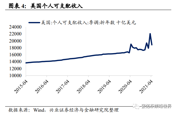 美国需求增速高点已现,补库存已到后半段。整体而言,一季度在财政刺激的支持下,商品消费快速上升,导致了实际库存的下降。但严重的供需错配推升了通货膨胀,导致名义库存量不降反升。一季度库存变化主要由需求层面带动,但往后来看,美国的财政刺激增速高点已过,4月份起居民可支配收入出现明显回落,需求端或较快回落。