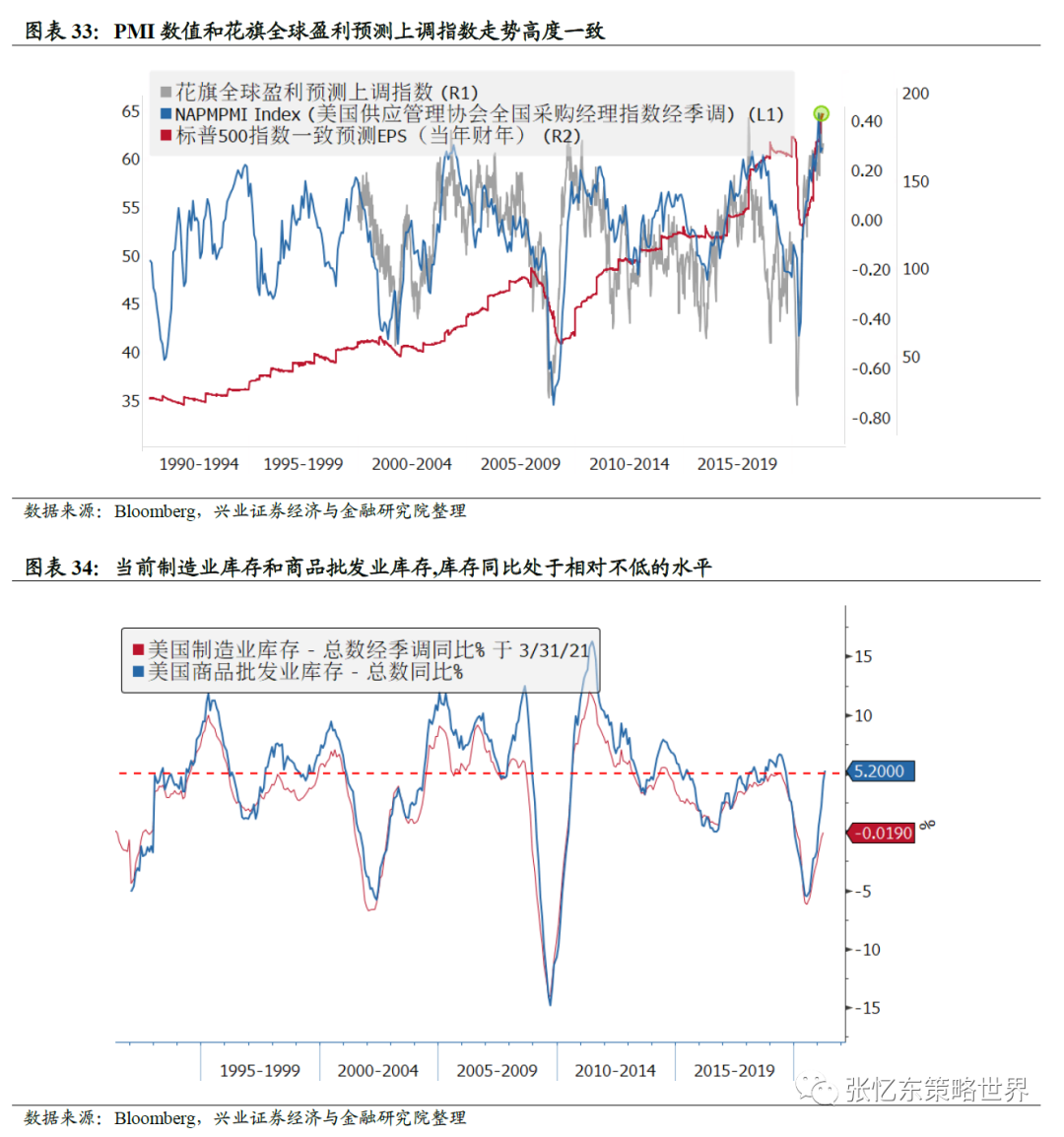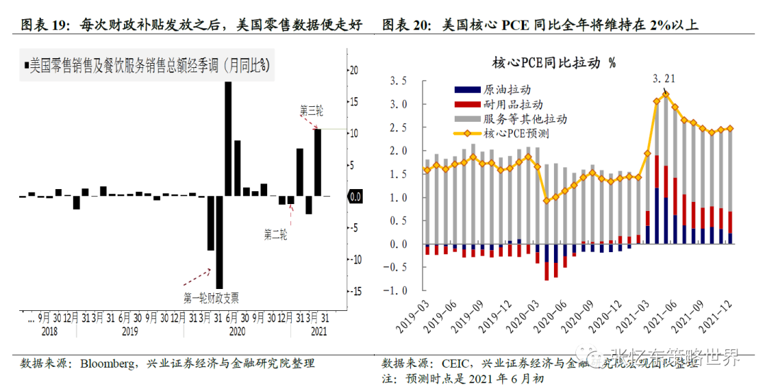 其次,下半年通胀可能在阶段性见顶之后继续高位震荡。未来数月,经济活动恢复,对于美国CPI的服务分项的推动将趋于明显,而服务业在美国CPI的占比约60%。根据兴证宏观团队的预测,美国核心PCE同比全年将维持在2%以上。