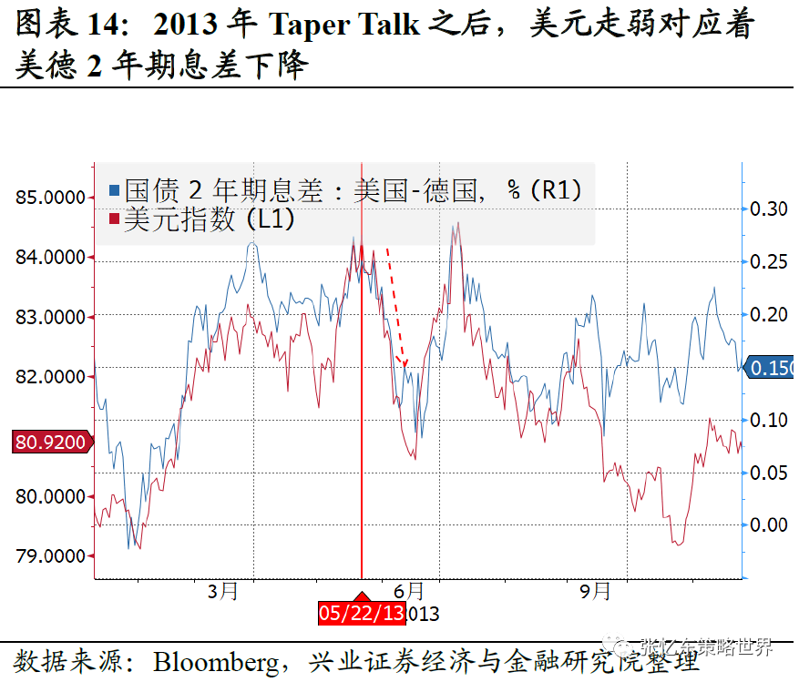 历史经验显示,Taper未必带来强美元。2013年0522Taper Talk之后美元指数不但没有走强反而下跌,原因是欧央行处于缩表进程,美国-德国2年期息差反而缩窄,因此欧元走强、美元指数走弱。