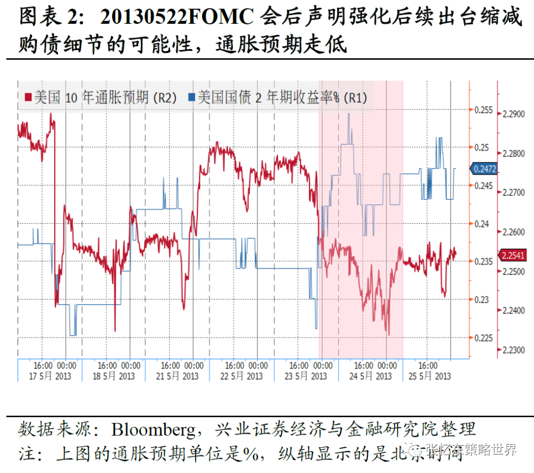 这个情况和2013年联储转鹰类似,紧缩预期和中长期通胀预期负相关。2013年,0522TaperTalk超预期,短期利率走高,同时中长期通胀预期被压缩。0619FOMC会后声明强化后续出台缩减购债细节的可能性,通胀预期走低。0918FOMC会议超预期未正式宣布缩减计划,短期利率回落,通胀预期随即走高。二者相关性在高频视角下相关性明显。