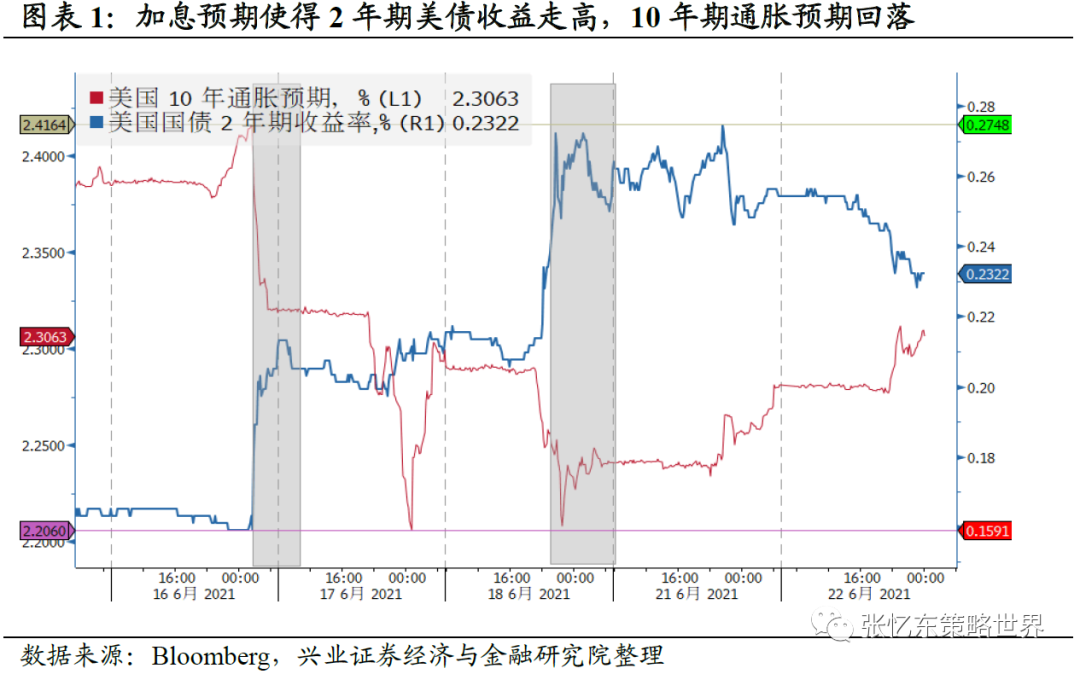 6月FOMC会议散点图调整使得加息预期提前,因此2年期美债收益率从低点的0.159%一度升11.6bp至0.275%;同时通胀预期被压缩,10年期通胀预期从高点的2.415%一度下跌20.9bp至2.206%。高频视角下,每次2年期美债收益率阶段性回升均对应着10年期通胀预期的回落。