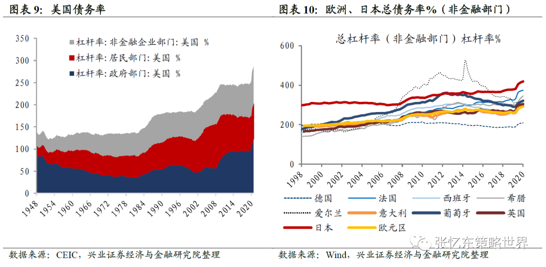 首先,当前以美国为代表的西方国家已深陷高债务的泥潭,难以承受高利率之痛。据国际清算行统计,截至2020年12月数据,美国的总债务率(包括政府、居民和非金融企业)高达296.1%,其中,政府债务率高达122.8%,创150年新高。欧元区总债务率高达288.5%。