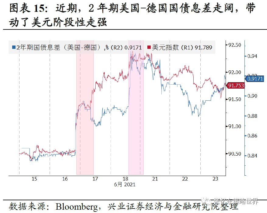 1.5、即便Taper落地,美元中短期也难以大幅走强。2013年0522Taper Talk之后美元指数反而下跌,原因是欧央行处于缩表进程。这一次,短期联储“偏鹰”带动2年期美债收益率大幅走高,2年期美国-德国国债息差走阔,美元暂时走强。中期,联储货币政策难以实质性收紧,欧元受益国际贸易景气度提升,美元指数难以大幅走高。