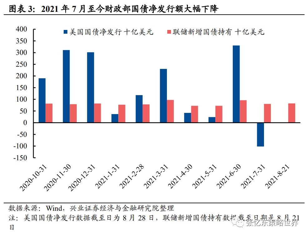 往后看,9月下旬是需要关注的重要时间点:1) 9月22日联储会议是否会释放Taper的前瞻指引。2)9月10日参议院休假结束,美国债务上限问题有待解决。3)10月1日,美国新财年预算将可以动用预算调整程序推动立法,拜登3.5万亿美元刺激计划是否会推进。当前是政府债务上限约束下,美国国债发行的真空期,而联储持续买债,导致美债利率处于低位。9月底可能迎来反转。