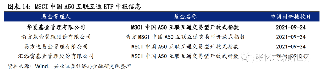 3.4、推出在即的A50 ETF 将进一步便利国内投资者进行指数投资,分享中国经济双循环战略下的长期机会。9月24日,包括华夏基金在内的四家基金公司正式申报MSCI中国A50互联互通ETF,10月18日获得证监会批准。四只产品首次募集规模上限均为80亿元,总计将有320亿元规模的基金发行。