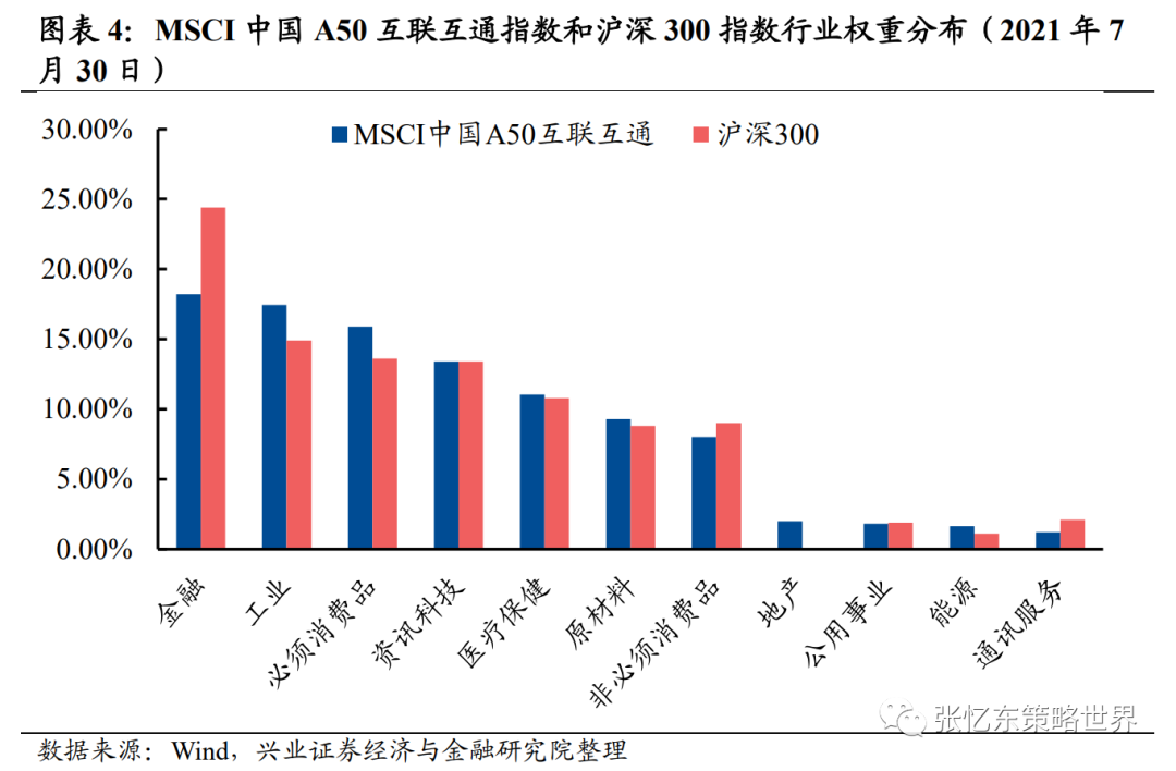 1.1、MSCI 中国 A50 互联互通指数的行业分布更均衡,能全面反映中国多元机会。截至2021年7月末,MSCI中国A50互联互通指数按GICS行业统计,金融18.2%,能源加原材料10.93%,必须消费加非必须消费品23.92%,工业17.45%,医药11.05%,科技加通信服务14.62%。相比富时中国A50指数,金融和消费占比更低;相比沪深300,金融占比更低,先进制造业占比更高。