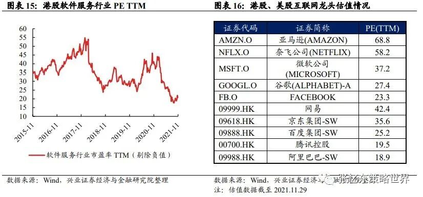 1)互联网龙头的估值处于近年低点,远低于美国同行。11月下旬港股互联网公司大跌,因为部分互联网龙头公布的业绩不及预期,叠加新一轮疫情以及近期互联网监管的新政策压制风险偏好。