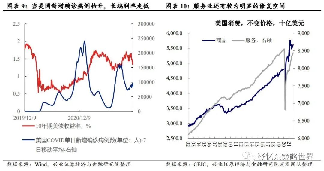 2022年上半年随着这轮Omicron疫情冲击的弱化,疫情“锁顶”效应将弱化,美国服务业还将有修复空间,长端利率有望短期加速上行。当前,美国的服务业实际消费低于长期趋势,商品消费则高于长期趋势,按照疫情冲击前5年期的样本,2014年2月-2019年2月间,按照不变价计算的服务业消费量/商品消费量约为1.86倍,截至2021年10月,这一数值仅为1.5;即便是考虑到服务业消费朝着长期趋势回归的中性情况下,也还有较为明显的修复空间。