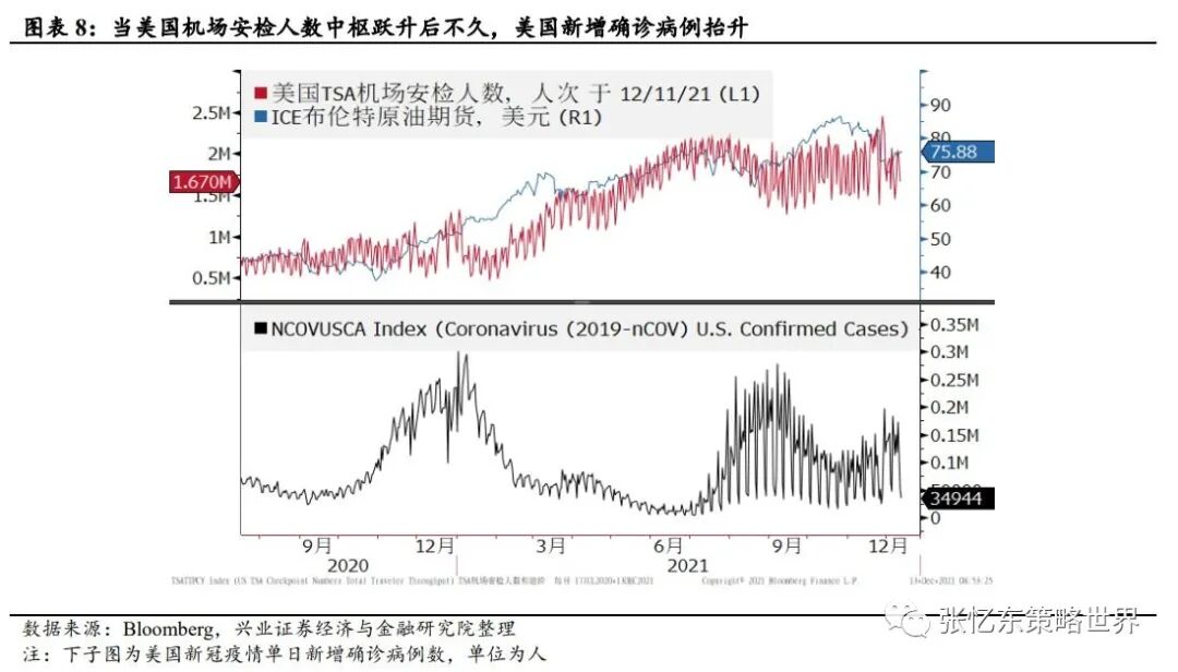 2021年每当疫情缓和、美国服务业进入修复阶段,长端利率都有上行动力;但之后,人员的流动带来更多的新增病例,进而对疫情的担忧提升,从而给长端利率施加下行的压力。当美国TSA机场安检人数中枢跃升后不久,美国新增确诊病例抬升,长端利率走低。这些阶段包括,去年6月份美国2次疫情冲击、今年7月份Delta variant冲击和今年11月底Omicron variant的恐慌性冲击和本土确诊。