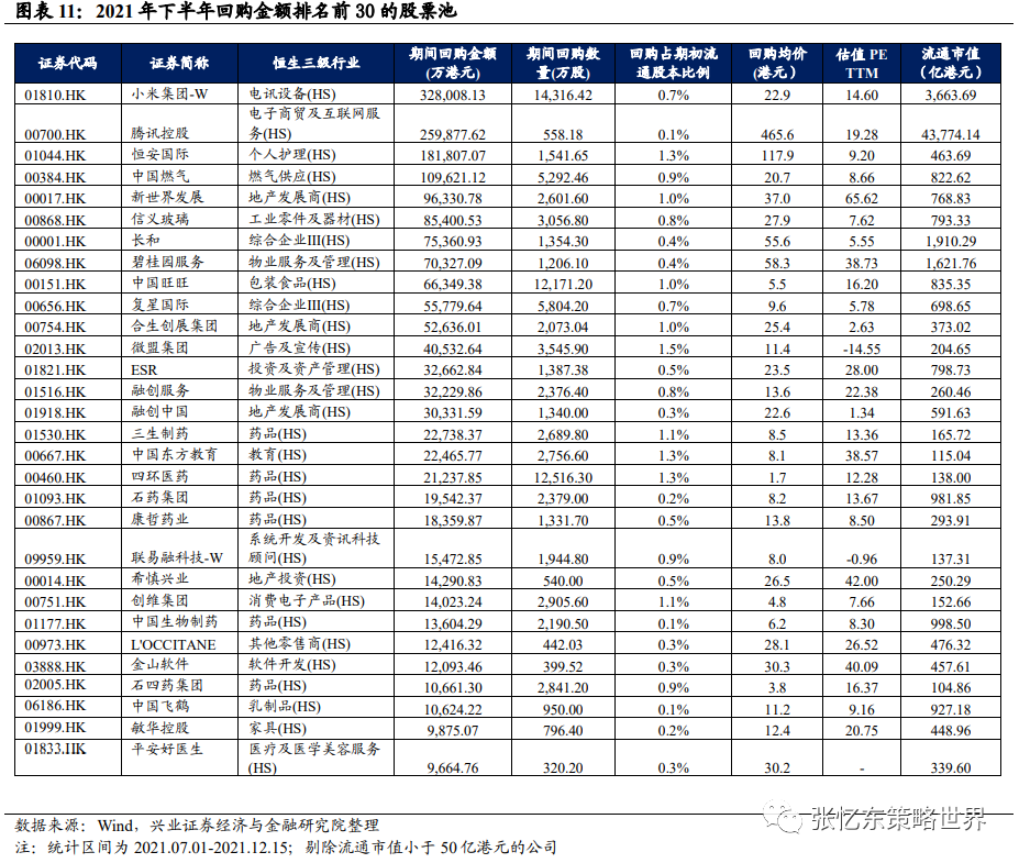 此次回购潮从2021年二季度开始,2021 年下半年随着港股较大幅度下跌而进入高潮,不到半年时间回购力度已经超过 200 亿港元,超过以往历史任何一个半年度数据。下半年截至 12 月 15 日,恒指已累计下跌了 18.8%。