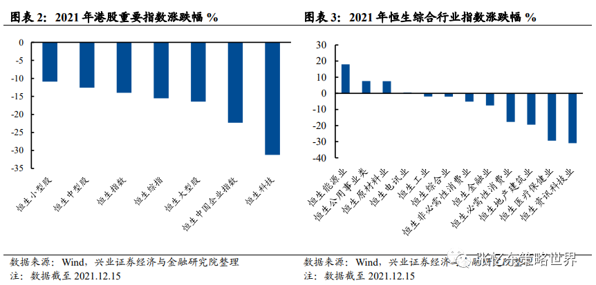 2021年以来,港股受多重因素影响回调明显,截至12月15日,恒指跌14.0%,恒生科技跌31.2%;行业上,恒生资讯科技业跌30.9%,医疗保健业跌29.3%,地产建筑业跌19.4%,必需消费业跌17.7%。