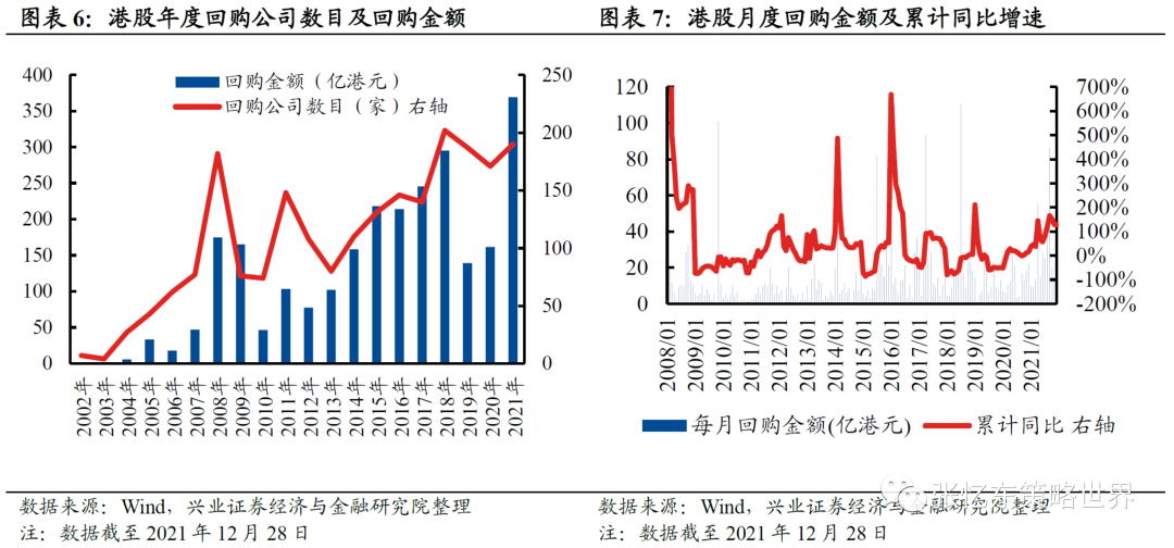 2021年二季度开始,港股回购活动明显升温,特别是下半年随着港股大幅度下跌而进入高潮,不到半年时间回购力度已经超过200亿港元,超过以往历史任何一个半年度数据。而从历史数据来看,2008年以来港股经历过五轮公司回购潮,均在熊市中发生,恒生指数价格与公司回购数量呈现负相关走势,大规模的公司回购往往预示着阶段性底部,并且后续均伴随着一波上涨行情。