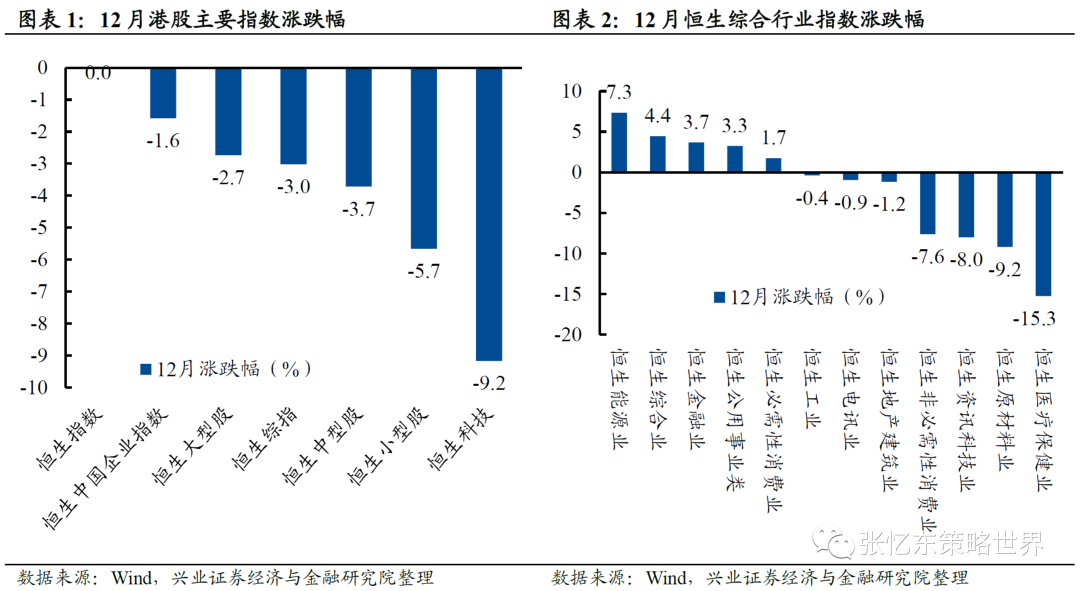 1.2、12月行情回顾:港股在底部区域反复拉锯。12月,港股主要指数均下跌,恒生指数跌0.0%,恒生国指跌1.6%,恒生综指跌3.0%;行业上,能源业、综合业和金融业领涨,医疗保健业、原材料业和资讯科技业领跌。