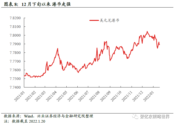 3.2、中期来看,外资增持中国资产趋势仍在。长线外资对于人民币中长期升值的预期升温,增持中国资产(包括国债以及外资熟悉的优质股票)的意愿提升,有利于港股反弹。12月下旬以来,港币兑美元不断走强,外资对中国资产包括国债和优质股票的青睐明显提升。2022年下半年,随着中国经济企稳复苏、人民币保持强势,外资增持中国股票特别是港股优质资产的意愿可能更强。
