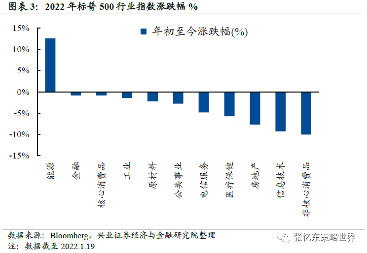 截至2022年1月19日,2022年以来,受美国长债利率上行影响,美股回调明显,美国标普500指数下跌4.9%,纳斯达克指数下跌8.34%,领跌全球大类资产,部分欧洲和亚洲市场也出现调整。行业上,除能源外,美股主要行业指数均下跌,其中成长板块的非核心消费品、信息技术领跌。