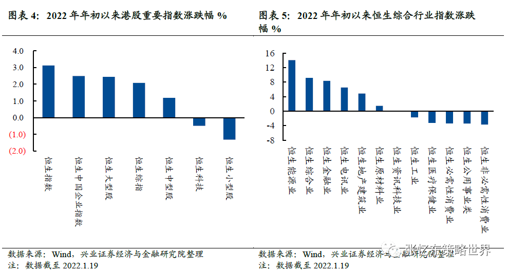 而与此同时,港股市场表现较佳,明显好于美股,在全球大类资产中表现也靠前。截至2022年1月19日,年初以来,恒生指数涨3.1%,恒生综指涨2.1%,恒生科技略下跌0.5%。行业上,价值行业领涨,恒生能源业(涨14.1%)、金融业(涨8.3%)、电讯业(涨6.5%)、地产建筑(涨4.9%)领涨。1月20日,港股市场表现更为强劲,恒指、恒生综指、恒生科技指数单日涨幅分别达到3.42%、3.79%和4.5%。