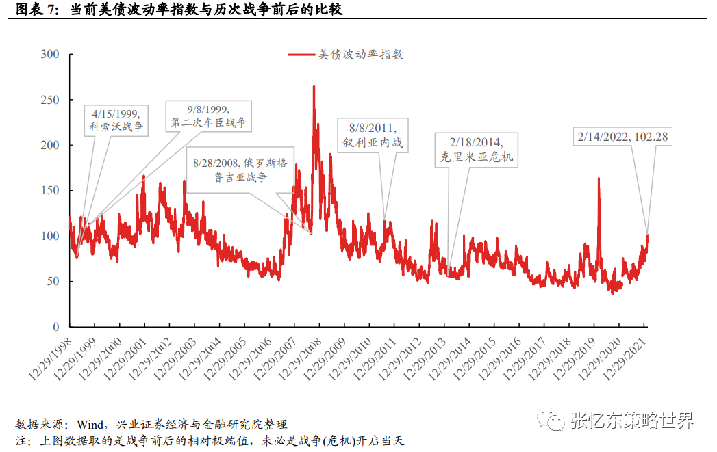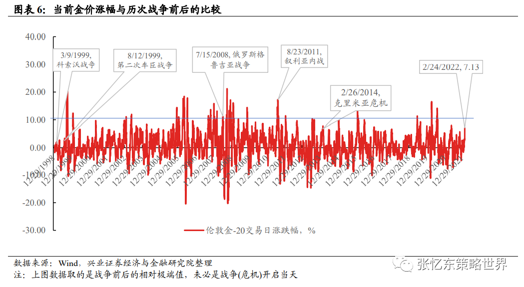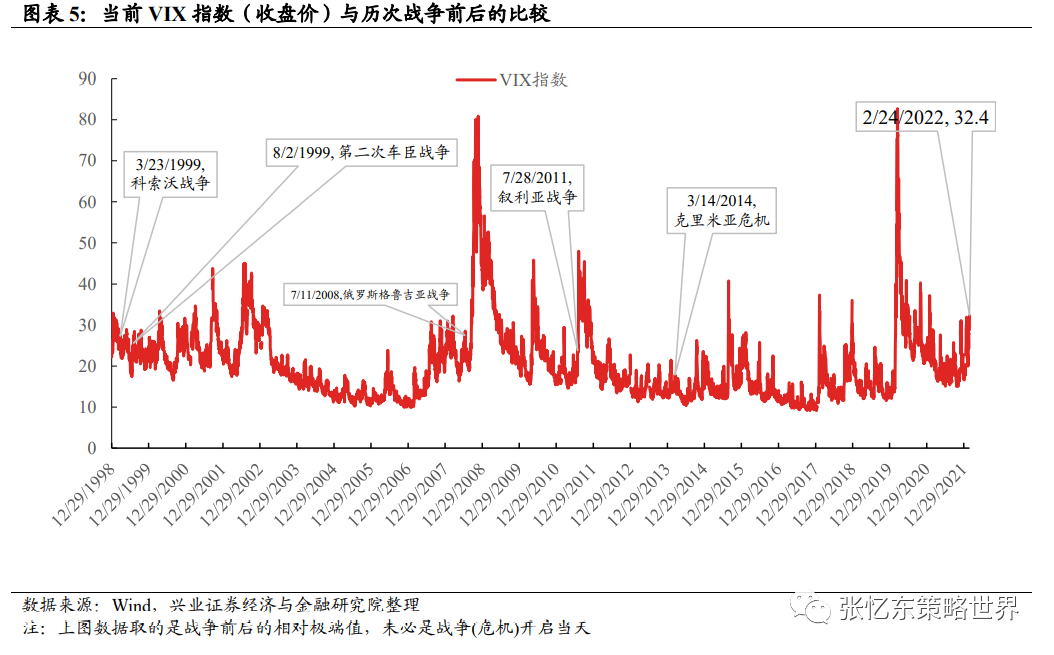 一、战争对股市的直接及短期影响主要体现在市场情绪和风险偏好的波动首先,随着此次俄乌战争打响,我们密切跟踪了美股、A股和港股相关的风险指标,并选取1999年至今有俄罗斯身影的历次相似的战争/危机情形做对比,包括1999年科索沃战争、1999年第二次车臣战争、2008年俄罗斯格鲁吉亚战争、2011年叙利亚内战、2014年克里米亚危机。相比于过去5次战争,当前反映市场避险情绪的指标均处于极端的水平,包括,俄罗斯五年期CDS、金价的涨幅、VIX指数、美债波动率等(见下文图表)。其次,相比于过去5次战争,我们复盘了A股港股和美股在战争(冲突)开启的前后股指的表现:从战争开始前10天涨跌幅来看,这次俄乌冲突之下美股和港股的跌幅已经大于历次战争;