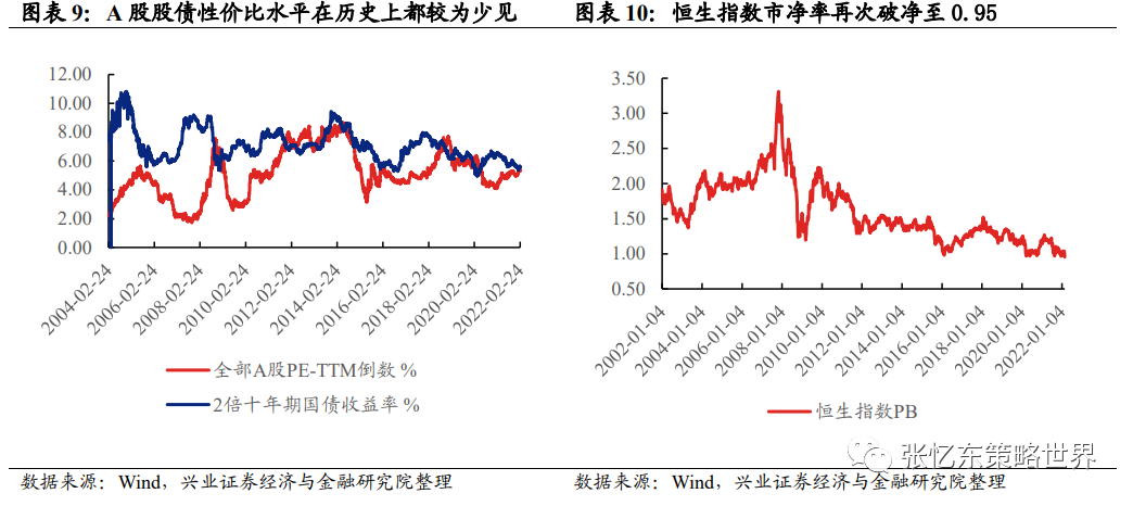 中长期,怀着怜悯的心逢低配置中国优质资产。目前A股和港股的优质资产,从估值情况来说,都不存在系统性风险。过去两周,对于部分优质中国资产而言,已经经历了较为深度的回调。截至20220224,全部A股的市盈率TTM为18.53倍,盈利收益率(市盈率倒数)5.39%,接近2倍十年期国债收益率的5.58%,这一股债性价比水平在历史上都较为少见。恒生指数市净率再次破净至0.95。