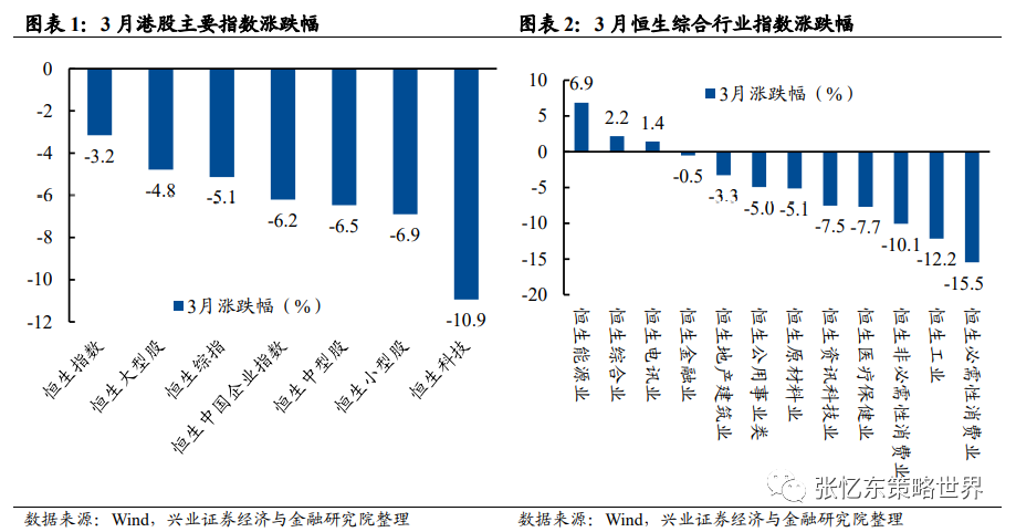 3月份港股主要指数中,恒生指数跌3.2%,恒生国指跌6.2%;恒生大型股跌4.8%,恒生中型股跌6.5%,恒生小型股跌6.9%,恒生科技跌10.9%。行业上,恒生能源业(涨6.9%)、综合业(涨2.2%)和电讯业(涨1.4%)领涨,非必需性消费业(跌15.5%)、工业(跌12.2%)和非必需性消费业(跌10.1%)领跌。